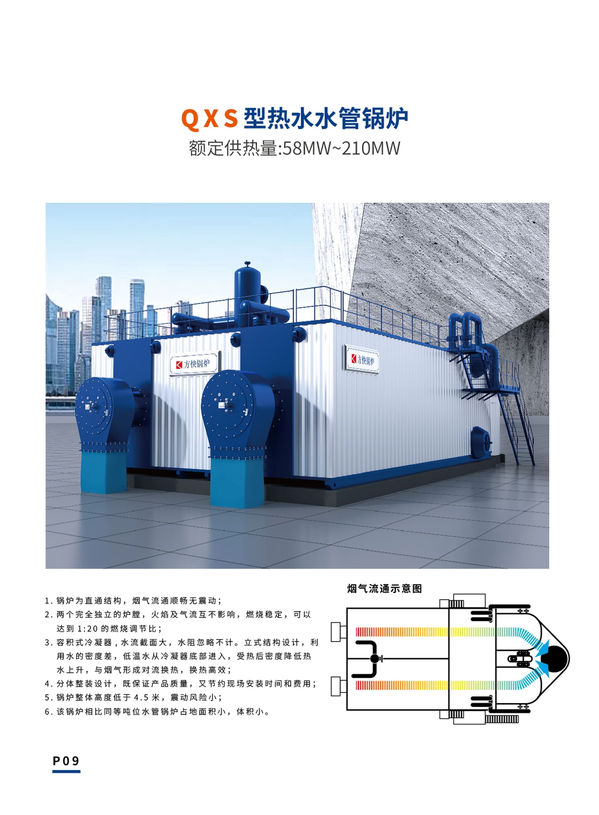 方快QXS型熱水水管鍋爐為直通結(jié)構(gòu),煙氣流通順暢無震動(dòng);兩個(gè)完全獨(dú)立的爐膛,火焰及氣流互不影響,燃燒穩(wěn)定,可以達(dá)到1:20的燃燒調(diào)節(jié)比;容積式冷凝器,水流截面大,水阻忽略不計(jì)。立式結(jié)構(gòu)設(shè)計(jì),利用水的密度差,低溫水從冷凝器底部進(jìn)入,受熱后密度降低熱水上升,與煙氣形成對(duì)流換熱,換熱高效;分體整裝設(shè)計(jì),既保證產(chǎn)品質(zhì)量,又節(jié)約現(xiàn)場(chǎng)安裝時(shí)間和費(fèi)用;鍋爐整體高度低于4.5米,震動(dòng)風(fēng)險(xiǎn)小;該鍋爐相比同等噸位水管鍋爐占地面積小,體積小。