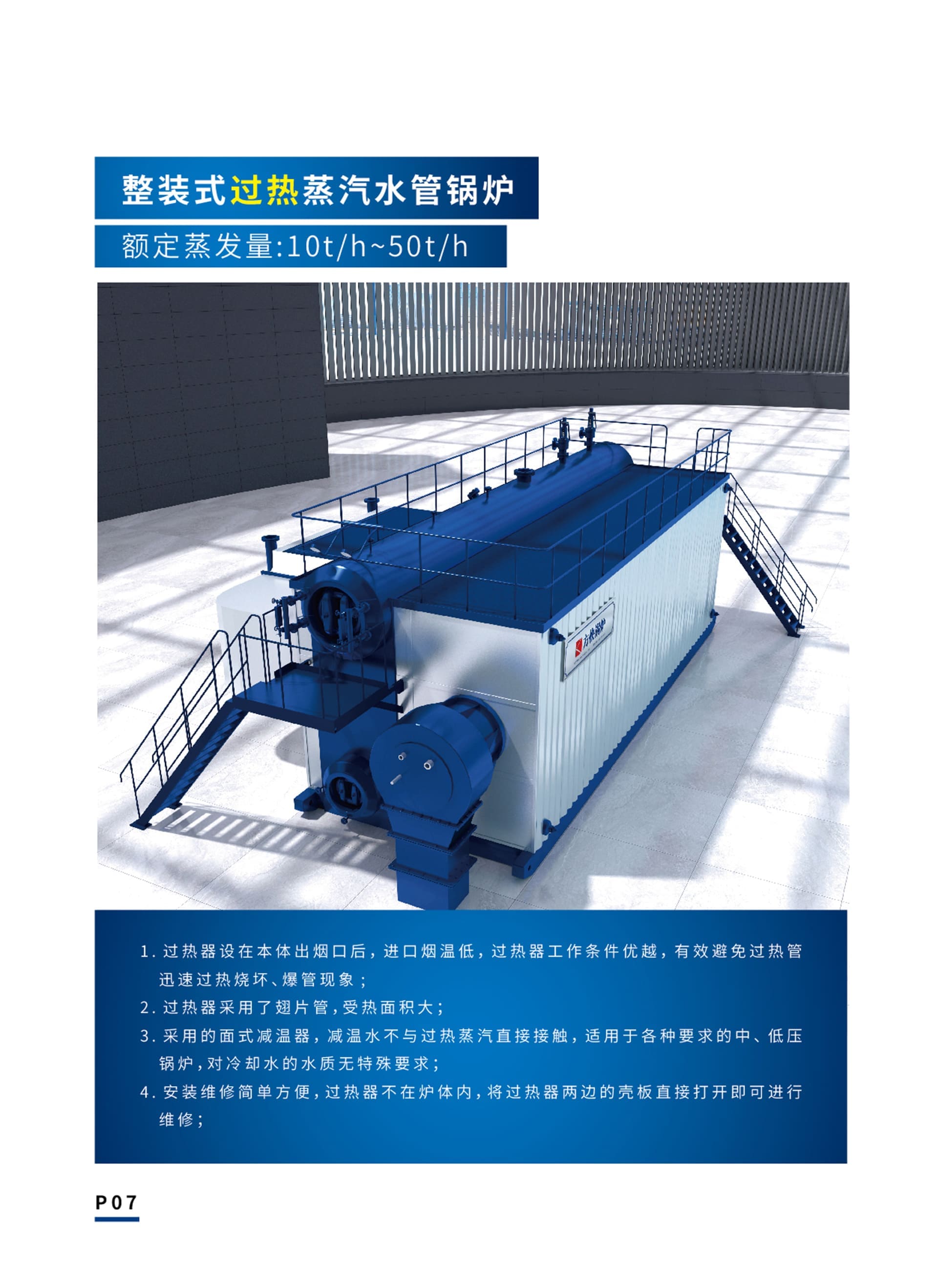 方快整裝式過熱蒸汽水管鍋爐。過熱器設在本體出煙口后,進口煙溫低,過熱器工作條件優越,有效避免過熱管迅速過熱燒壞、爆管現象;過熱器采用了翅片管,受熱面積大;采用的面式減溫器,減溫水不與過熱蒸汽直接接觸,適用于各種要求的中、低壓鍋爐,對冷卻水的水質無特殊要求;安裝維修簡單方便,過熱器不在爐體內,將過熱器兩邊的殼板直接打開即可進行維修