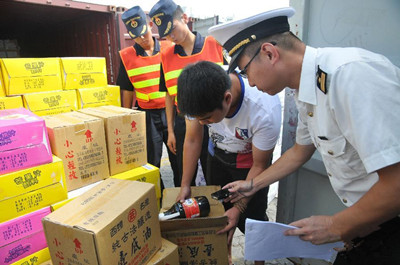 10月10日,廈門海關工作人員在查驗即將重裝入柜的臺灣“地溝油”涉事企業產品。