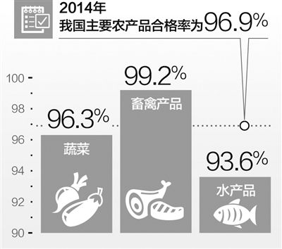 據介紹,2014年,農業部組織開展了4次農產品質量安全例行監測,共監測全國31個省(區、市)151個大中城市5大類產品117個品種94項指標,抽檢樣品43924個,總體合格率為96.9%。其中,蔬菜、畜禽產品和水產品監測合格率分別為96.3%、99.2%和93.6%,水果、茶葉合格率分別為96.8%和94.8%,農產品質量安全水平保持穩定。