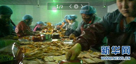 包裝車間內充斥著嗆人的辣條氣味,記者被熏得直流眼淚。近百名女工正在這里進行封裝,令人吃驚的是,那些剛剛上完廁所的女工連手都沒洗就徑直回到工位上。幾乎沒有人佩戴口罩和手套,都是直接用手將辣條一塊塊裝入塑料包裝袋。由于長時間接觸辣條,雙手被浸得泛著紅色的油光,一些人的手指出現紅腫甚至潰爛,纏著顏色各異的布條繼續工作。對于記者“為什么不戴手套”的疑問,這些女工表示,戴了手套笨拙,封裝慢,想多完成計件量就得徒手操作。