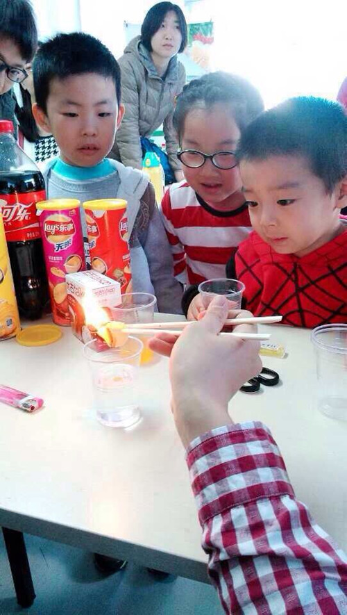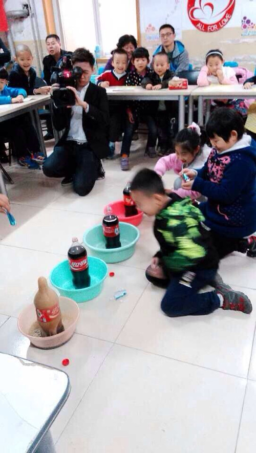 小朋友們?cè)诳蓸分蟹湃肓藥最w神秘物體,只見樂可瞬間噴射出來,小朋友和家長的驚呆了。
