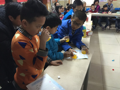 老師將事先調(diào)配好的果汁和從市場(chǎng)購買的果汁讓家長和小朋友們用感官來鑒別,猜錯(cuò)的還真不少。