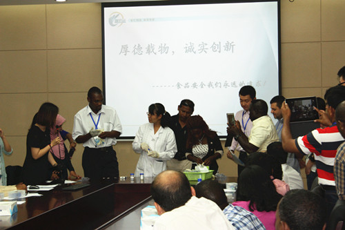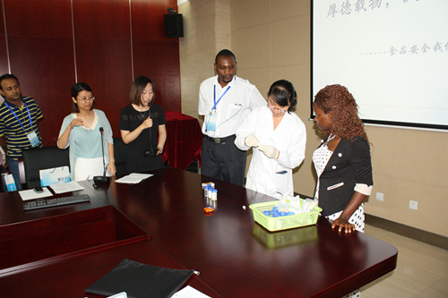 技術(shù)人員邀請(qǐng)?jiān)L問團(tuán)友人一起動(dòng)手實(shí)際操作,親自體驗(yàn)快檢產(chǎn)品操作便捷、測定時(shí)間短、檢測結(jié)果易于分辨的優(yōu)勢。