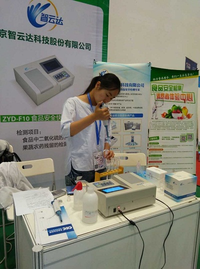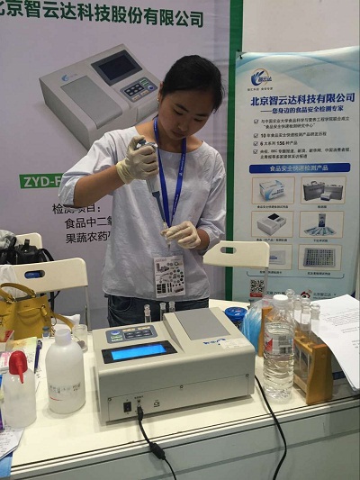 在“科學(xué)儀器走進(jìn)百姓生活”活動(dòng)展示區(qū),北京智云達(dá)為參會(huì)觀眾現(xiàn)場(chǎng)開展免費(fèi)的食品安全檢測(cè)展示,現(xiàn)場(chǎng)進(jìn)行了果蔬中農(nóng)藥殘留檢測(cè)、食品中二氧化硫檢測(cè)等演示實(shí)驗(yàn),圍觀群眾不時(shí)提出疑問,現(xiàn)場(chǎng)技術(shù)人員一一解答。