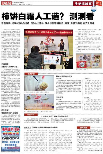 2016年12月08日9:00,北京智云達(dá)科技股份有限公司(以下簡稱“北京智云達(dá)”)與法制晚報攜手制作走進(jìn)勁松街道八棵松社區(qū)活動,為消費者免費檢測柿餅中是否含有葡萄糖和果糖、柿霜中是否含有淀粉。