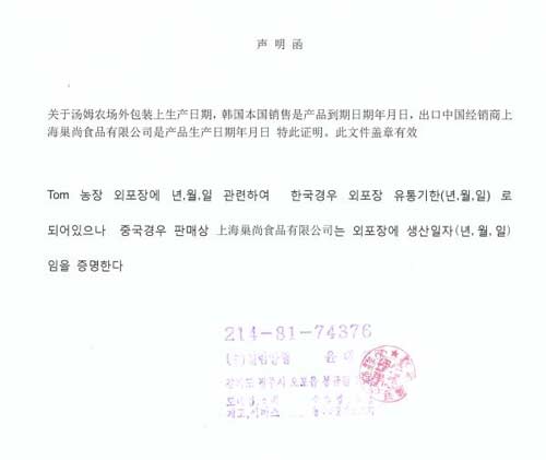 12月20日,1號(hào)店方面向澎湃新聞?dòng)浾哒f(shuō)明,韓國(guó)廠家確認(rèn)了國(guó)內(nèi)經(jīng)銷商的說(shuō)法,出口巢尚食品的湯姆農(nóng)場(chǎng)產(chǎn)品外包裝所標(biāo)日期為生產(chǎn)日期,并出具了說(shuō)明函。