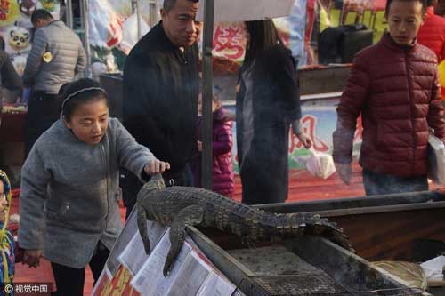 2017年1月31日,山東濱州,一燒烤攤主在春節(jié)廟會上銷售現(xiàn)烤現(xiàn)賣的鱷魚肉。廟會上,各類烤肉串、羊肉串已經(jīng)不鮮見,但烤鱷魚肉不少趕廟會的人還是第一次見,許多市民爭相嘗鮮。為了吸引顧客,攤主擺了張著大嘴的整條鱷魚當(dāng)招牌。