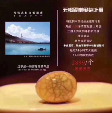 “精選桐木關(guān)絕品金駿眉泡制,海拔1140米農(nóng)家散養(yǎng)土雞蛋,江湖上傳說(shuō)的牛欄坑肉桂,精選果碳、潮州紅泥炭爐,冬蟲夏草、鐵皮石斛等八味秘制配料,經(jīng)過(guò)24小時(shí)文火慢煨,12小時(shí)靜置而成的——無(wú)錫殿堂級(jí)茶葉蛋,2899元每顆且限量供應(yīng)。近日,無(wú)錫太悅度假酒店公開銷售的茶葉蛋成為了網(wǎng)紅。