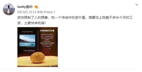 對(duì)于該茶葉的走紅,網(wǎng)友議論紛紛。有人認(rèn)為這是嘩眾取寵,和某針管書法家有異曲同工之妙,有人詢問(wèn)”吃了會(huì)上天?“,還有人一口認(rèn)定”這不是洗錢嗎“,也有網(wǎng)友就所謂”精選果碳、潮州紅泥炭爐“提出質(zhì)疑:”再牛逼的木材燒出來(lái)的火溫難道還有差別?“,更多網(wǎng)友自嘲,貧窮限制了人的想象,吃一個(gè)傳說(shuō)中茶葉蛋,竟要花上我差不多半個(gè)月的工資。