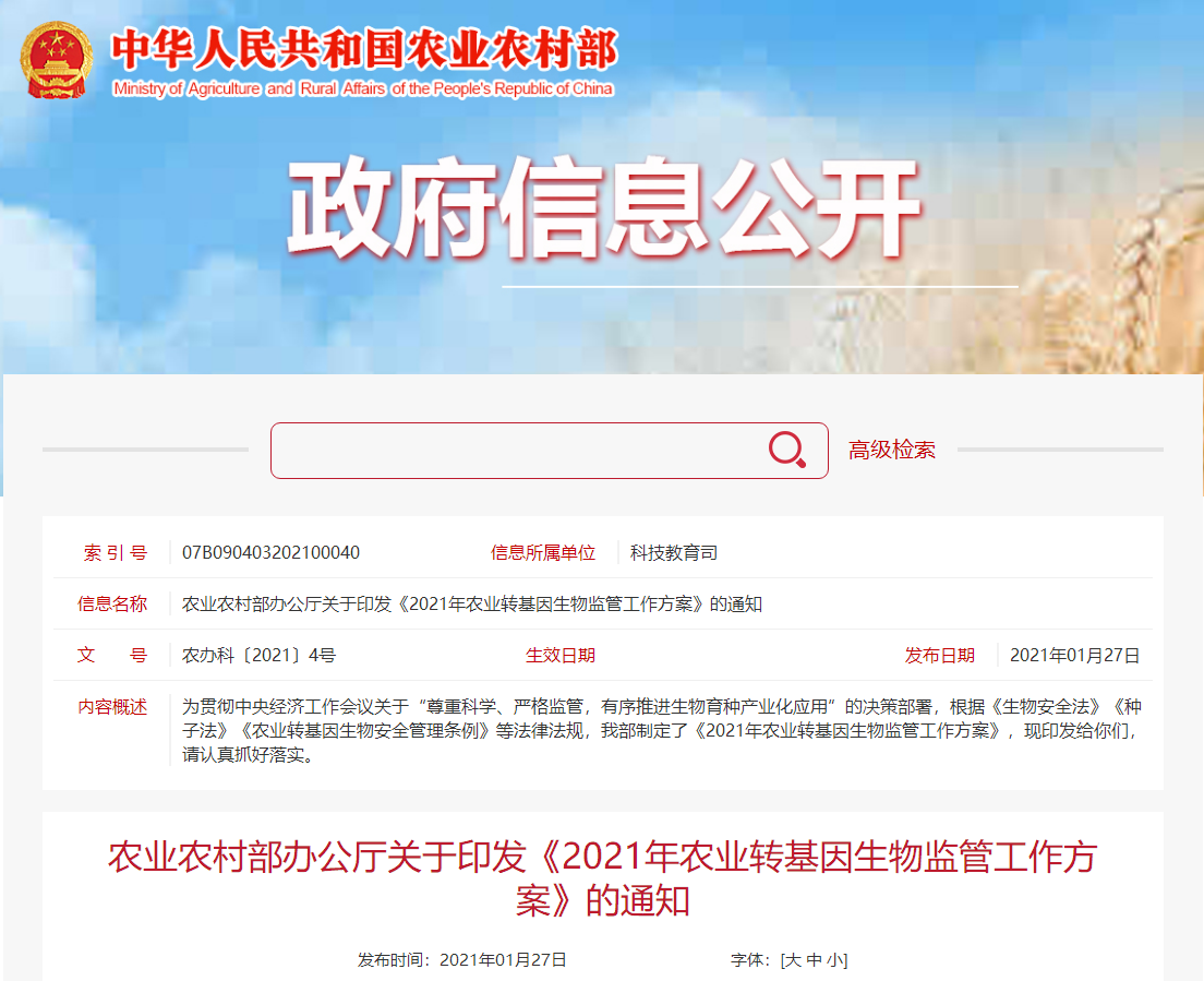 各省、自治區(qū)、直轄市農(nóng)業(yè)農(nóng)村(農(nóng)牧)廳(局、委),新疆生產(chǎn)建設(shè)兵團(tuán)農(nóng)業(yè)農(nóng)村局: 為貫徹中央經(jīng)濟(jì)工作會(huì)議關(guān)于“尊重科學(xué)、嚴(yán)格監(jiān)管,有序推進(jìn)生物育種產(chǎn)業(yè)化應(yīng)用”的決策部署,根據(jù)《生物安全法》《種子法》《農(nóng)業(yè)轉(zhuǎn)基因生...[詳情]