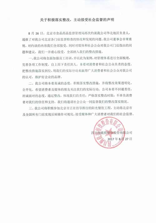 8月26日,北京市食藥監(jiān)局再次約談“海底撈”北京公司。通報了本次對“海底撈”全面檢查發(fā)現(xiàn)的問題,包括消毒記錄不全、餐飲具混放、未戴工作帽及口罩等。市食藥監(jiān)局在約談中指出,要求“海底撈”總部落實食品安全主體責任,全面進行限期整改,并按照《關于海底撈火鍋北京勁松店、北京太陽宮店事件處理通報》中所承諾,主動向社會公開整改情況,主動接受社會監(jiān)督。