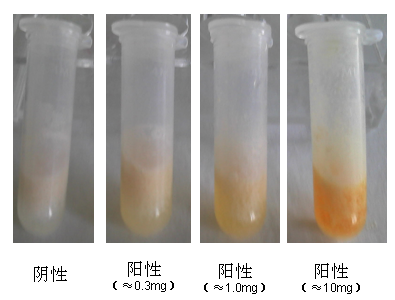 化妝品中的喹諾酮類物質(zhì)與檢測試劑反應(yīng)生成橙黃(紅)色化合物,含量越高,橙黃色越深。