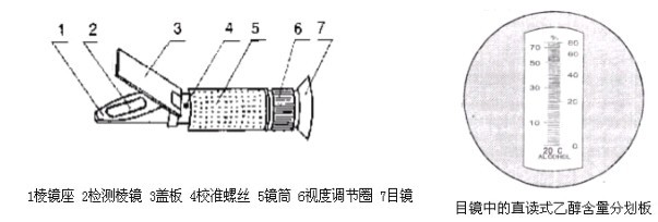 4.4 取酒樣 5~7 滴放在檢測棱鏡面上,徐徐合上蓋板,以下操作與 3.2 相同。視場明暗分界線處所示讀數(shù),即為乙醇含量%。重復(fù)操作幾次,使讀數(shù)穩(wěn)定。4.2 取酒樣 5~7 滴放在檢測儀棱鏡面上,緩緩合上蓋板。讀取視場明暗分界線處所示讀數(shù),即為乙醇百分含量。重復(fù)操作幾次,使讀數(shù)穩(wěn)定。