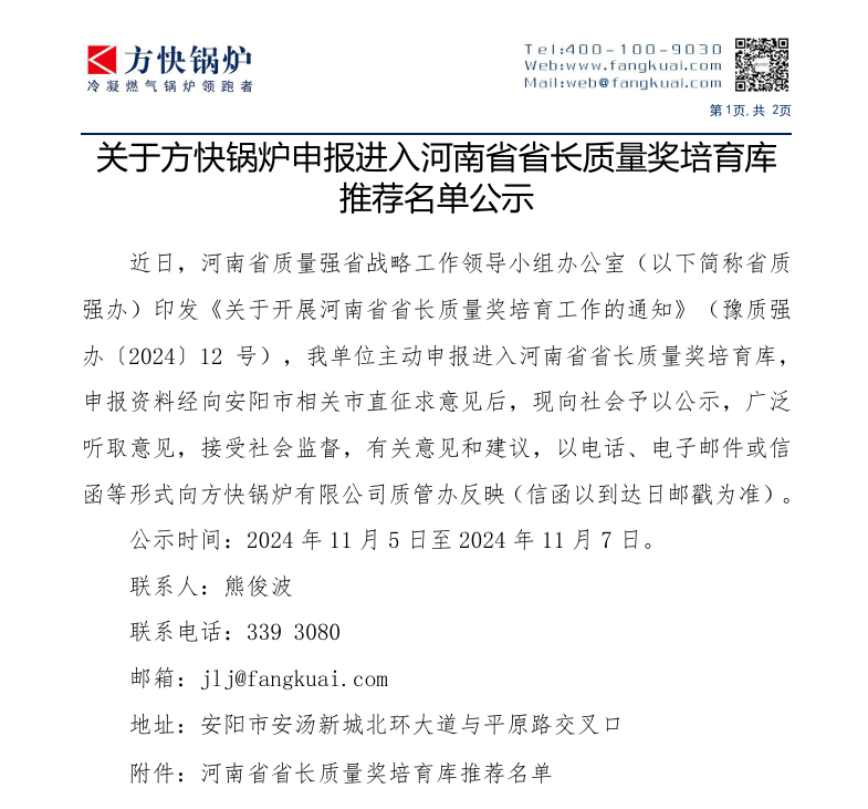 關(guān)于方快鍋爐申報進(jìn)入河南省省長質(zhì)量獎培育庫 推薦名單公示