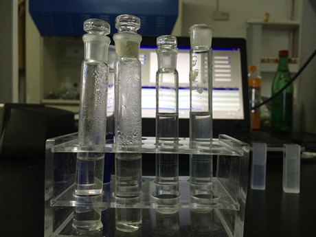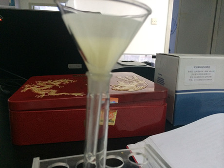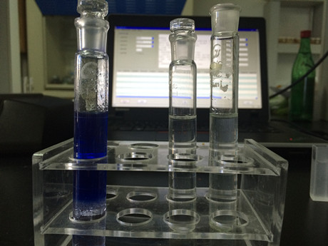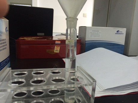 3、樣品管:取制備好的樣品液加入A溶液1mL,搖勻,加入三氯甲烷4mL,蓋上塞子,較為快速顛倒20次,靜置5min,取下層溶液進(jìn)行檢測。