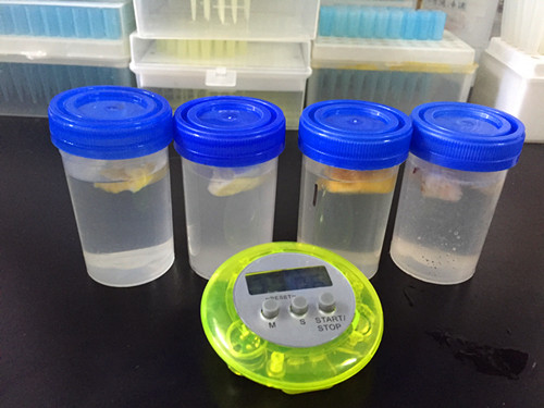 針對鄭先生的擔心,我們就先對水果干進行二氧化硫定性的分析,若有存在再進行定量分析。首先我們稱取每種凍干1g,剪碎加水49ml進行稀釋提取,靜置10min備用;
