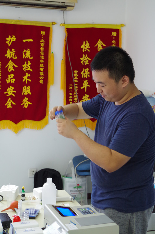 下午由技術人員現場做快檢實驗操作,涉及肉制品、乳制品。其中主要演示果蔬農藥殘留的快速檢測(農殘儀、農殘卡);乳制品中三聚氰胺檢測;甲醛的快速檢測;食品中二氧化硫的快速檢測;劣質“地溝油”快速檢測;肉制品中瘦肉精快速檢測等項目。