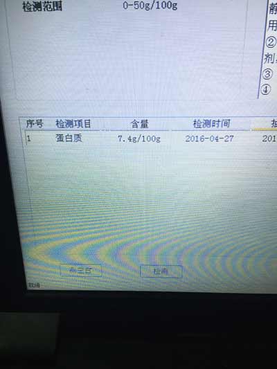 結(jié)果顯示,樣品中蛋白質(zhì)含量為7.4g/100g,與產(chǎn)品包裝標(biāo)示不符合。