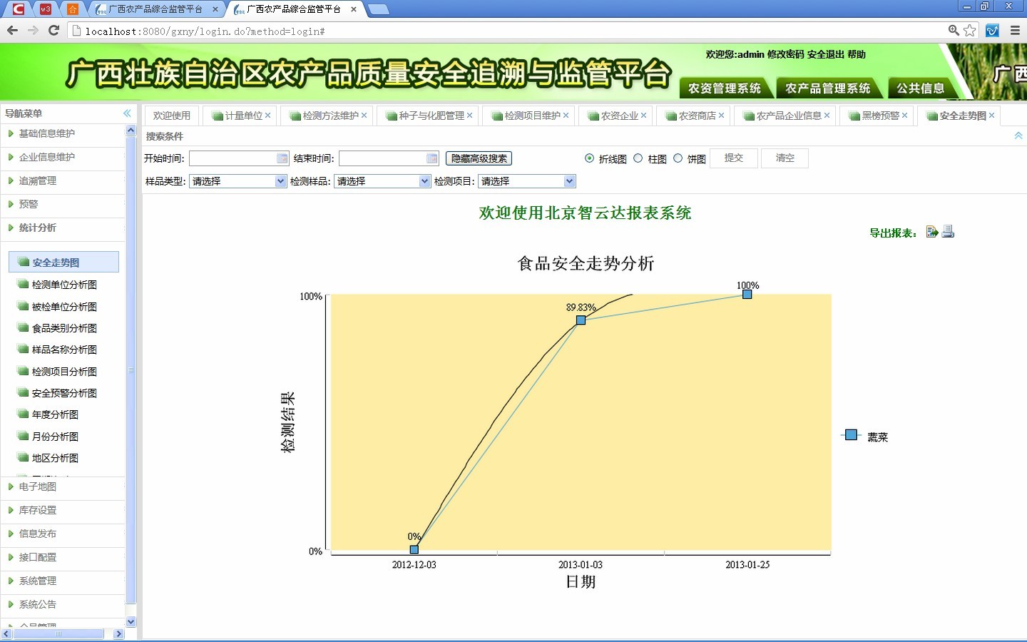 1.1檢測數據預警 、安全走勢分析統計 、檢測單位分析統計 、被檢單位分析統計 、產品類別分析統計、專項產品分析統計、專項項目分析統計、指令預警分析統計、省內年度分析統計、省內月份分析統計、監管地區分析統計、同期比對分析統計等統計功能。安全走勢統計功能如圖1-1所示