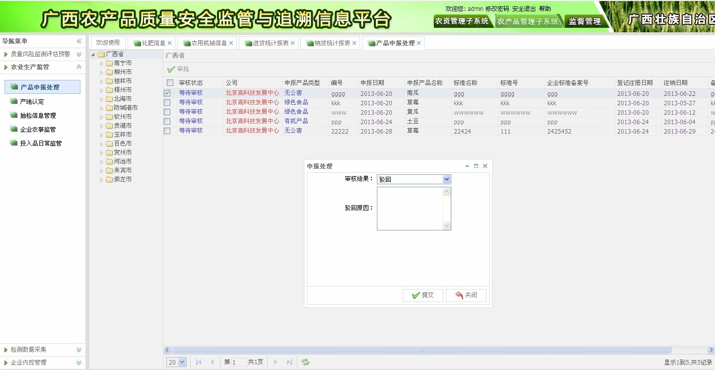 監管部門負責處理三品產品的認證審核。審批結果包括通過和駁回,如此申報駁回需填寫駁回原因。如圖2-1所示