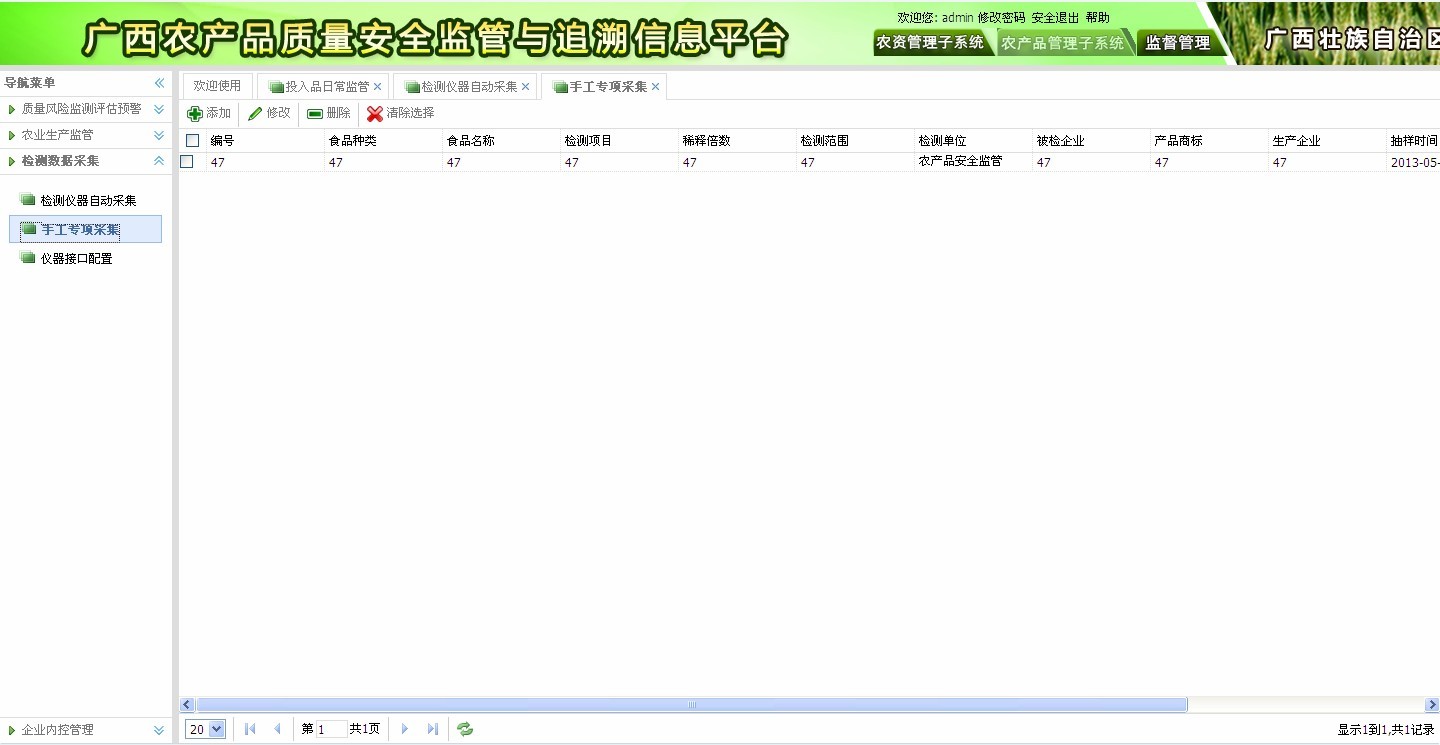 無需自動采集的檢測數據通過該版塊手動錄入采集結果。提供增刪改功能,便于操作。如圖3-2所示