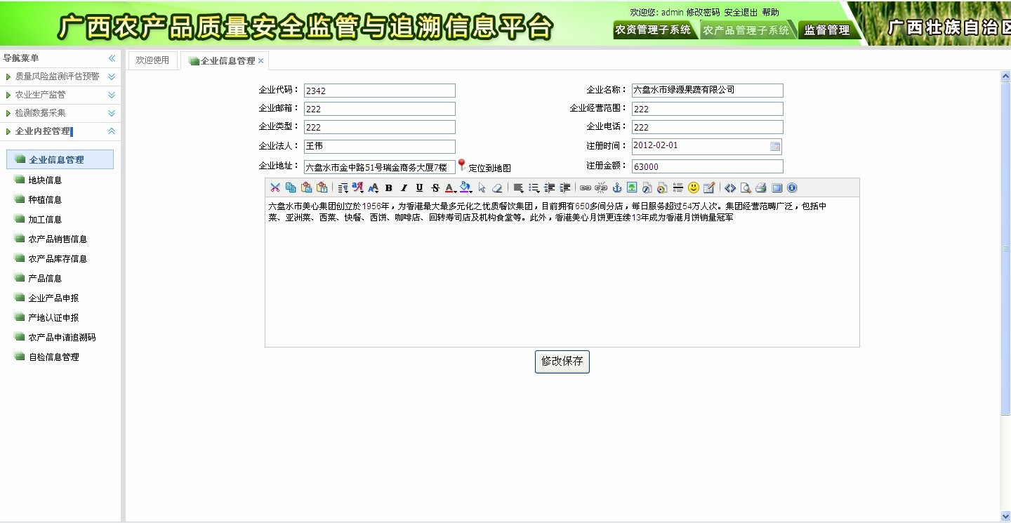 以農產品會員用戶登錄系統,監管企業的基礎信息,如有變動在此處修改,方便用戶的操作。如圖4-1所示